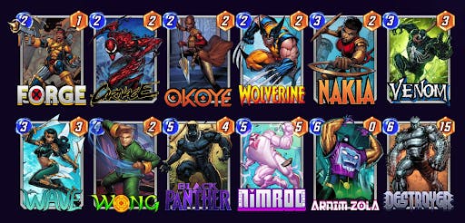 This deck tries to keep flexible about the turn 6 play, depending on what’s available. I’m too cowardly to build decks that hinge on drawing 1 specific card (which is why I can never get Mr. Negative to work). Wong/Panther/Zola is a powerful combo when you can pull it off, but the unexpected fun comes from Wong/Destroyer for double Nimrod. A backup option is dropping Carnage/Venom to get double Nimrod activation too. Since this tournament, I’ve dropped Forge as he’s too much of a tempo hit and replaced him with Colossus, but I’m iffy about that too. Okoye and Nakia are useful when they work, and something to put down anyways since I don’t have anything else really planned for Turn 2/3. I’m thinking about dropping Wave too. If I do keep Wave, it’s to put down with Wolverine and bluff my opponent into thinking I’m running Galactus.